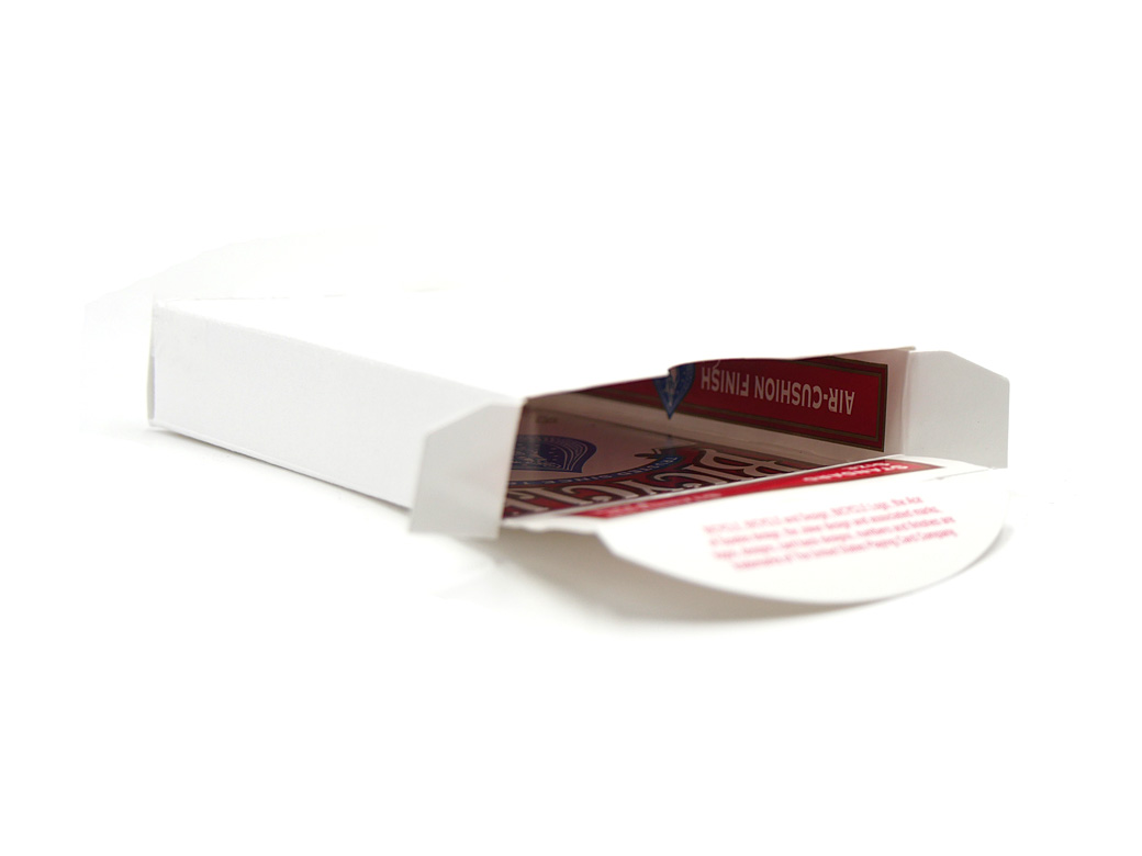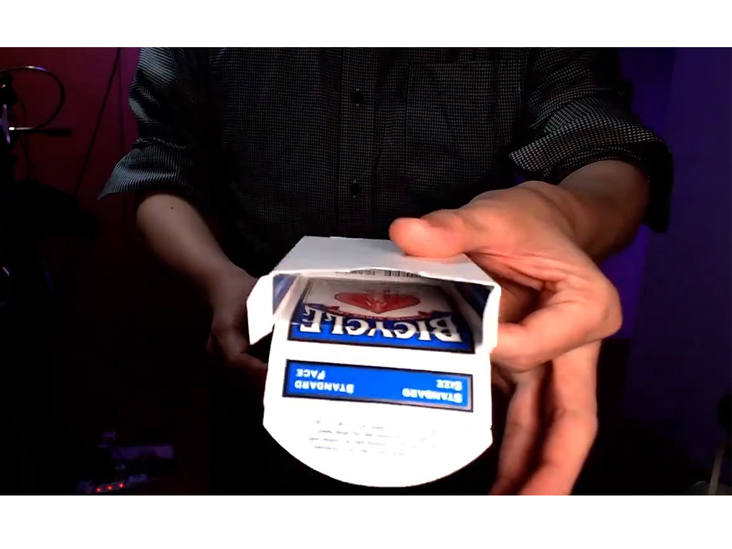 カードケースを取り出します。手をかざすと、ケースの柄が消え、全面真っ白になってしまいます。本当に全面真っ白なのですべての面を見せられます。デックを取り出し、中を見せると、ケースの印刷がすべて内側に移っています。